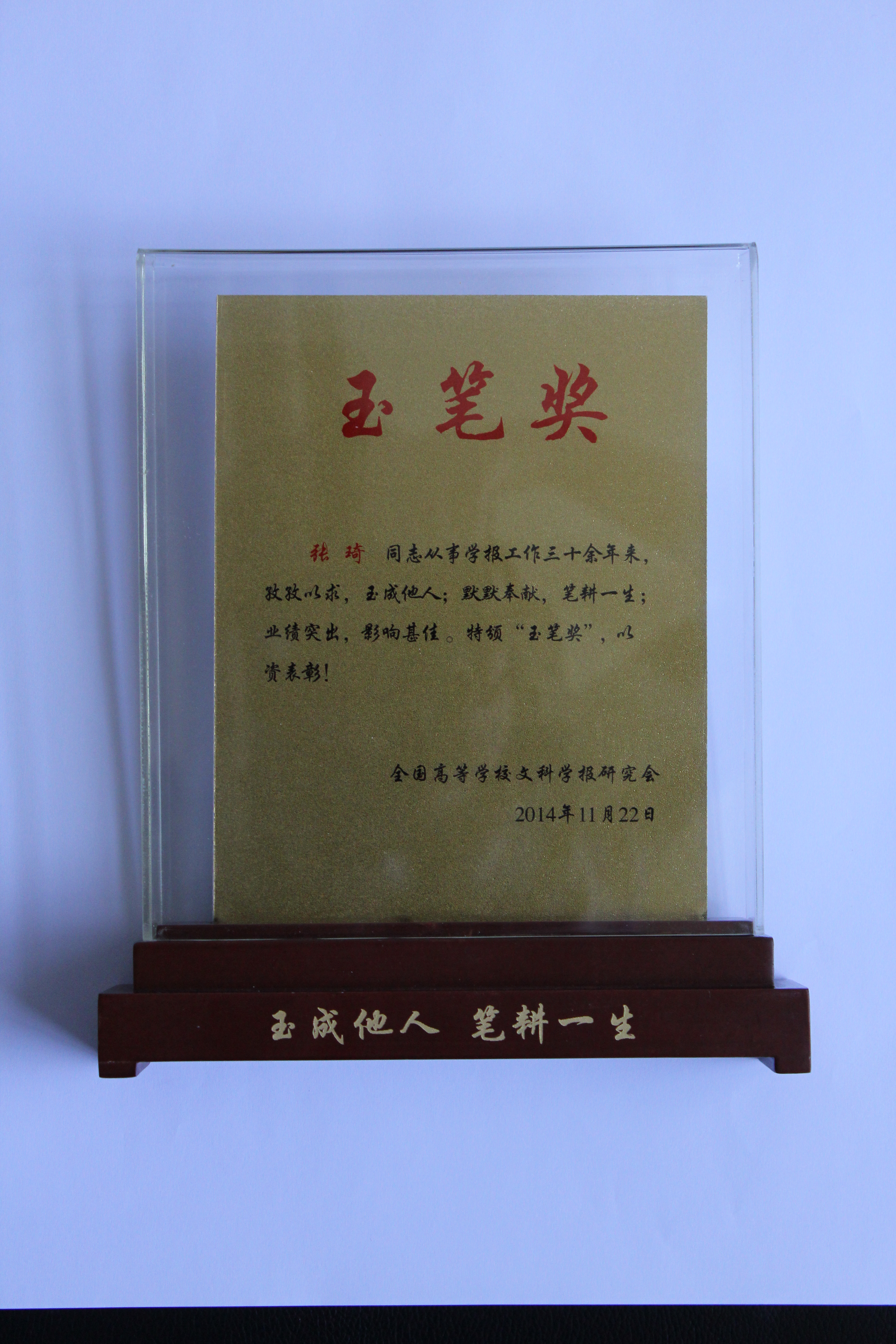 张琦编审多年从事学报编辑工作,是一位资深编辑,为表彰他在学报编辑事业中的突出贡献,全国高等学校文科学报研究会于2014年授予张琦编审“玉笔奖”。张琦编审把所获荣誉看作是对学校的认可,将奖牌捐赠给综合档案室永久保存,并与全体齐鲁师院人分享此荣誉。